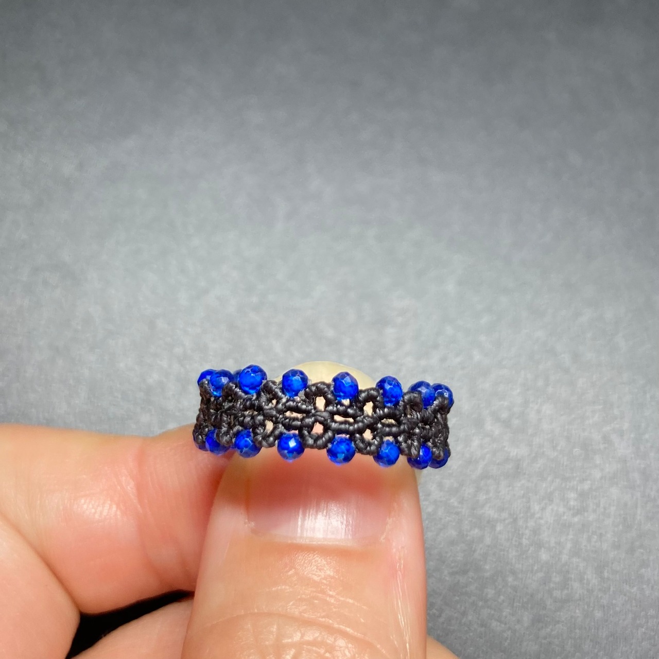 合成ブルーサファイアのカットビーズとワックスコードで、シンプルな繰り返しモチーフのリングに仕立てました